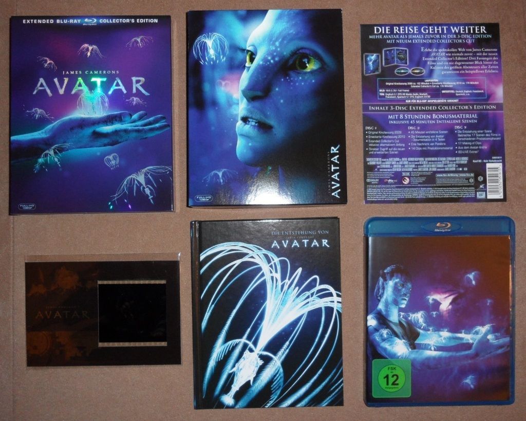 Habe mir unter anderem die Avatar Collectors Edition geholt. Bei nur 12,99 Euro konnte ich nicht anders. Ich habe sofort zugeschlagen. Da sind ja gleich 3 Cuts komplett auf einer Blu Ray drauf. Kinoversion, erweitere Kinofassung und der längste Cut namens "Extended Collectors Cut" geht mal fette 178 Minuten. *sabber* Das beiliegende Artbook ist der Hammer. Schriftgröße in ganz normal wie bei Comics. Super Conzept Arts, Buchgröße in Blu Ray Format als Taschenbuch quasi. Dazu noch ne eingerahmte Filmszene. Hey was will man mehr für nur 12,99 Euro? Und die war sauschnell ausverkauft.^^